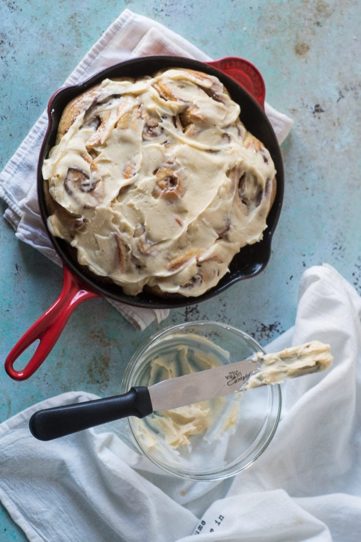 这些肉桂卷使用最简单的不用揉的奶油蛋卷面团,这是一种非常多用途的面团,适合丰富的早餐。面团需要休息一晚上,所以一定要提前计划,但要放松,因为这几乎不涉及任何工作。这些肉桂卷可以在前一天晚上准备好,盖上盖子,冷藏一晚,第二天早上就可以烤好,这对你来说很方便——只需要多花几分钟就可以烤好。这些肉桂卷令人愉悦的丰富性意味着剩菜很好保存(不是说你会有)。我喜欢在铁锅里烤,这样可以保温更长时间,但任何10英寸的圆形锅都可以。