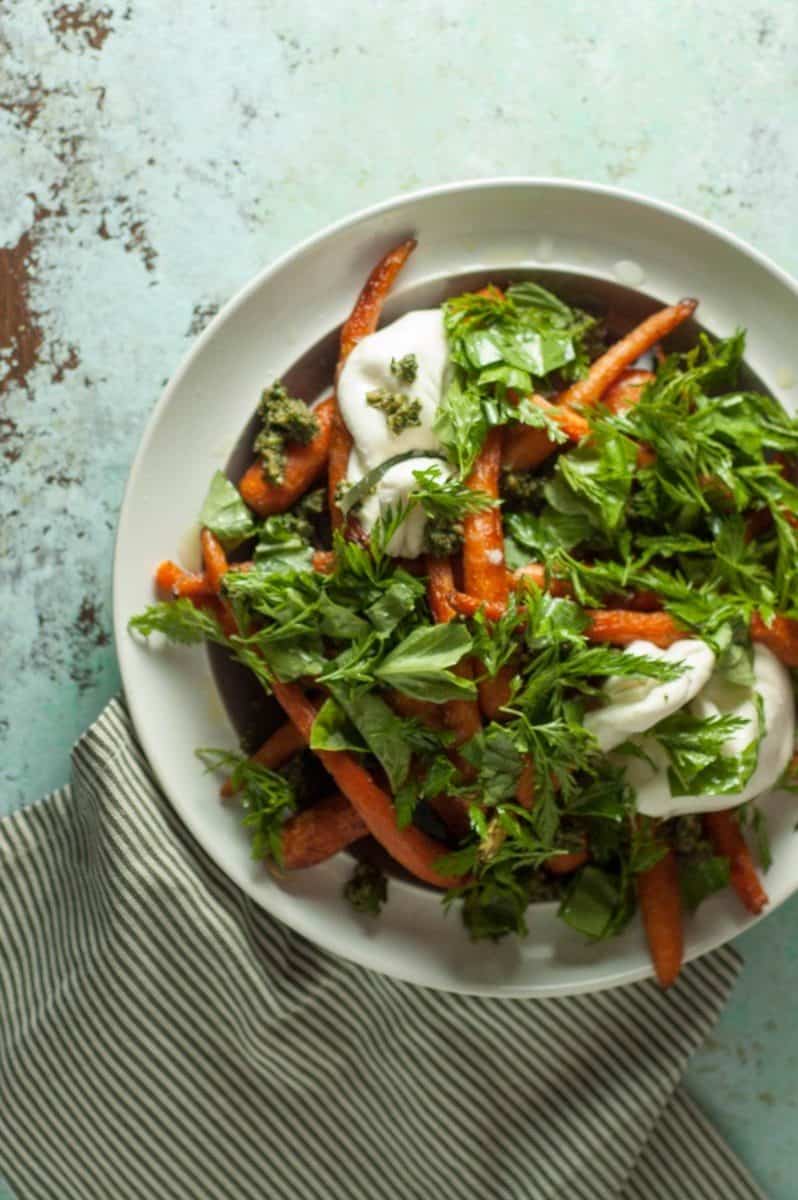 烤胡萝卜配布拉塔和胡萝卜香蒜沙司和一个女孩和她的绿色评论