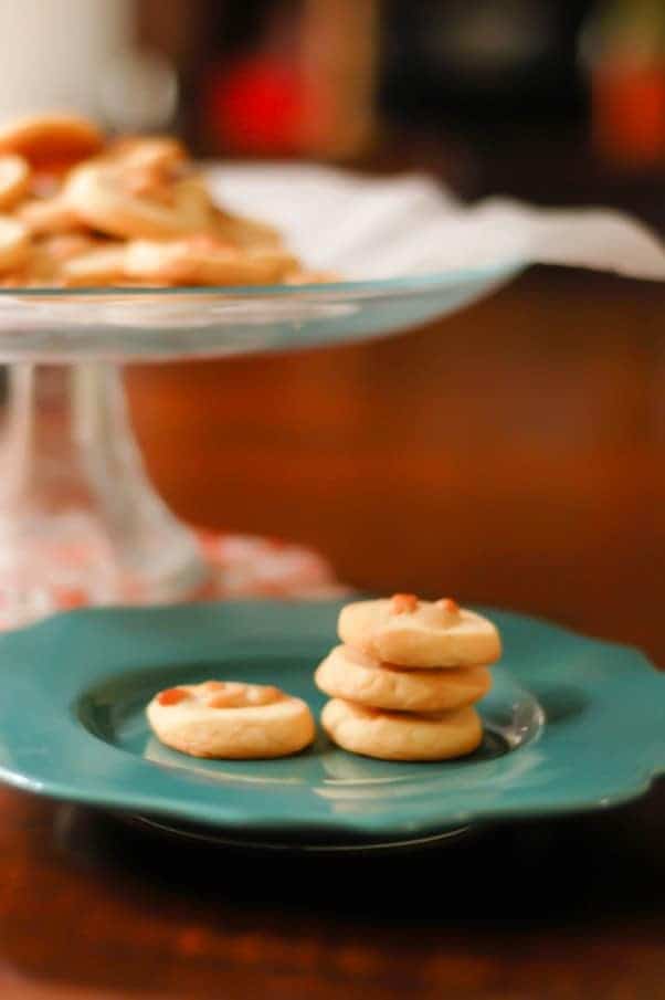 这些黄油味,坚果味,香草味的小甜饼入口即化。我已经大大简化了从原始版本制作这些饼干的方法。我还把松仁牛轧糖切成两半。这些都是精致精致的饼干——对成年人来说很好,但可能不太适合你生活中的小孩子。基础cookie非常好,我在考虑将来用它来做其他事情。最初的食谱需要玉米粉,但我用的是玉米粉因为我手头有一些而且我喜欢这种混合玉米味道而又不那么粗糙的方式,但这里的量足够小,我相信哪怕是一盘玉米粉也可以。你也可以用玉米粉如果你手头上有的话。